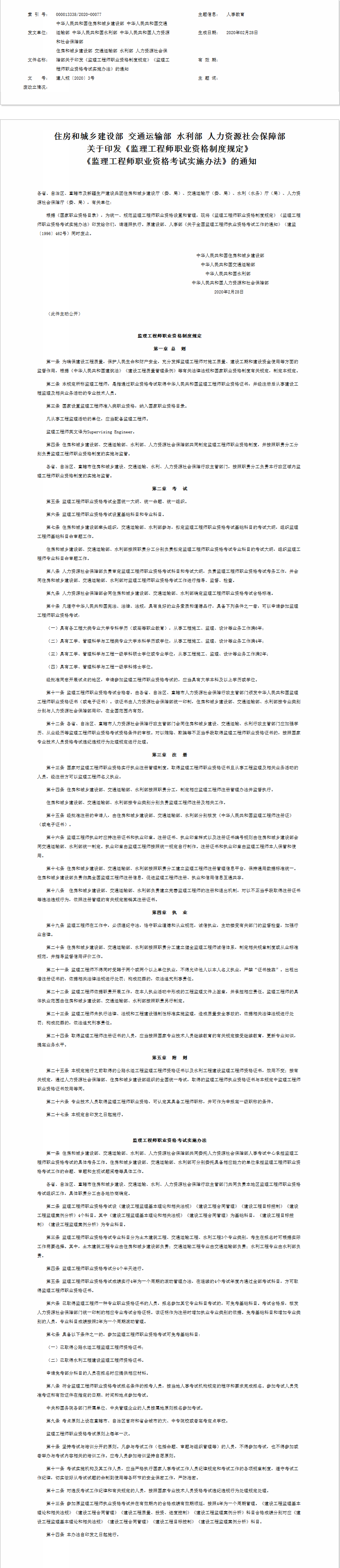 轉(zhuǎn):住房和城鄉(xiāng)建設(shè)部、交通運輸部、水利部、人力資源社會保障部關(guān)于印發(fā)《監(jiān)理工程師職業(yè)資格制度規(guī)定》、《監(jiān)理工程師職業(yè)資格考試實施辦法》的通知