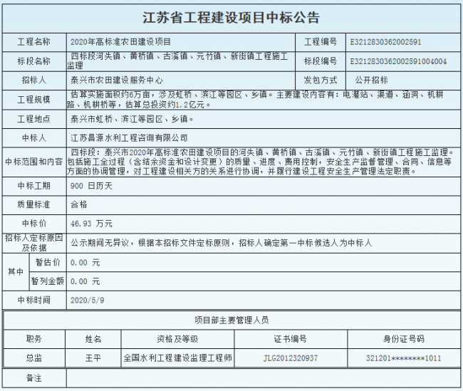 公司中標2020年高標準農田建設項目的四標段河失鎮、黃橋鎮、古溪鎮、元竹鎮、新街鎮工程施工監理