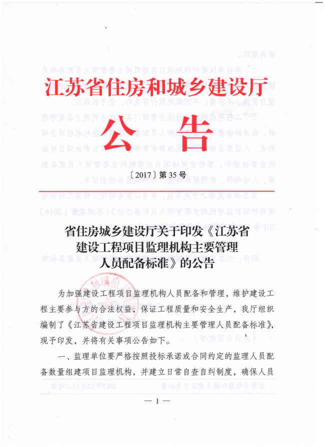 省住房城鄉(xiāng)建設(shè)廳關(guān)于印發(fā)《江蘇省建設(shè)工程項(xiàng)目監(jiān)理機(jī)構(gòu)主要管理人員配備標(biāo)準(zhǔn)》的公告(〔2017〕第35號(hào))
