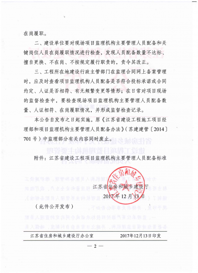 本公告自發(fā)布之日起實(shí)施,原《江蘇省建設(shè)工程施工項(xiàng)目經(jīng)理部和項(xiàng)目監(jiān)理機(jī)構(gòu)主要管理人員配備辦法》(蘇建建管〔2014〕701號(hào))中監(jiān)理部分有關(guān)內(nèi)容同時(shí)廢止。